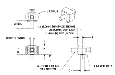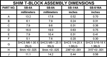 The DBM Shim T-Block is a very compact shim block for adusting locator details on welding and other fixtures and machinery. The T-Block is slotted. The pin is held to a tight tolerance. Two sizes are available with metric or inch fastener. Comes complete with socket head screw, washer and shim pack.